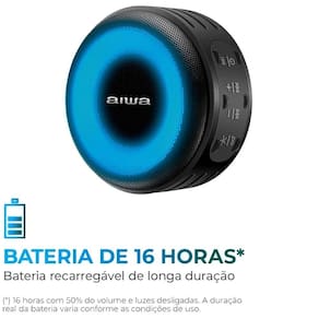 Especificações técnicas Características Principais: Altura: 9,7 cm Largura: 5,4 cm Comprimento/Profundidade: 9,5 cm Peso: 400 g Alimentação: Bateria de lítio recarregável Bluetooth: Versão 5.3 Certificado Anatel: 18367-22-05236 Cor: Preto Marca: AIWA Potência de Saída: 10 W RMS