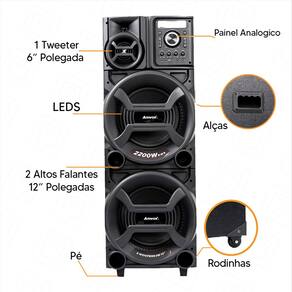 São 2200W RMS de pura potência! Essa caixa da Amvox é equipada com dois woofer de 12” polegadas e um Tweeter de 6 que proporciona mais qualidade para suas músicas.