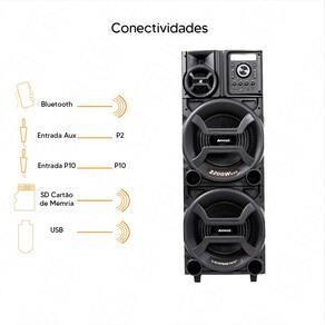 Recheada de funcionalidades! Essa caixa de som oferece conexões e tecnologias como Bluetooth, mas você também pode reproduzir músicas através de entradas físicas, como pen drive (USB), cartão de memória. Além disso, essa caixa de som também tem entrada duas entradas P10 para a conexão de microfone e instrumentos musicais.
