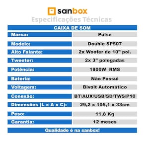 Com 1800W RMS de pura potência. A SP507 é equipada com dois woofers de 10” polegadas e dois tweeters de 3” polegadas. Além disso, essa caixa de som não possui bateria interna, pois, ela funciona em tensão de bivolt automático conectada diretamente na tomada.