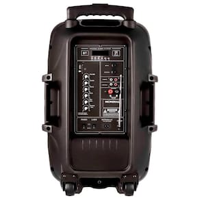 Caracteristicas: Tipo: Amplificada Potencia RMS: 500W Bluetooth: Sim Entradas: USB; AUX; MIC e GUITAR Radio AM/FM: FM estereo Equalizador: Sim Bateria: Sim Acompanha microfone: Nao Controle remoto: Nao Alca para transporte; Sim Roda para transporte: Sim Entrada tripe: Sim Origem: Nacional