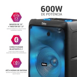 Com a Caixa de Som Amplificada da Philco você terá tudo o que é necessário para animar suas festas, encontros e momentos de lazer com um áudio potente e efeitos luminosos impressionantes.