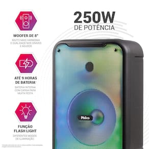 Além disso, a tecnologia Philco Connection e o Bluetooth 5.1 com TWS possibilitam a conexão entre duas unidades PCX3800, proporcionando uma distribuição sonora ainda mais ampla e envolvente. A função Flash Lights, com diferentes modos de iluminação, adiciona um toque visual ao ambiente, tornando cada momento mais especial.