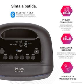 Características Adicionais: A função Flash Lights, com diferentes modos de iluminação, adiciona um toque visual ao ambiente, tornando cada momento mais especial. A Caixa de Som Amplificada PCX3800 não é apenas um equipamento de áudio, mas uma experiência completa de som e luz. Conte com a Caixa de Som Amplificada Philco Flash Lights 250W PCX3800 e transforme suas festas, reuniões e momentos de lazer em eventos inesquecíveis. Entrada USB para reprodução de música Entrada AUX IN (P2) Entrada cartão de memória para reprodução de música 1 Alto Falantes de 8" 1 entrada para Microfone externo (P10) com efeito eco e modo de prioridade Bluetooth 5.1 Rádio FM Flash Light Função Philco connection (conectividade entre duas PCX5200) TWS Função Repeat Bateria de 3,7V/3000mAh Modos Flash Lights Potência: 250W Modelo: PCX3800 Autonomia: 9 horas Conexões: Bluetooth Cartão de Memória USB Funções Radio FM Repeat Quantidade de Alto Falantes: 1 Acessórios: Cabo USB-C para carregamento, cabo auxiliar P2 Homologação Anatel: 03959-24-16592
