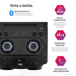Rádio FM com memorização de estações: Rádio FM 76MHz - 108MHz 1 entrada Auxiliar P2 1 entrada USB para uso de Pendrives Versão Bluetooth: 5.3 Entrada AC (127v/220v) automática 1 entradas de Microfone Bivolt Automático.