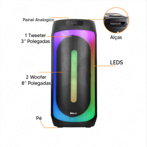 São 1600W RMS de pura potência! Essa caixa da Amvox é equipada com 2 woofer de 8” polegadas e um Tweeter de 3’’ que proporciona mais qualidade para suas músicas. Além disso, ela possui bateria interna recarregável bivolt com capacidade de autonomia de 4 horas.