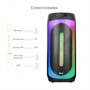 Recheada de funcionalidades! Essa caixa de som oferece conexões e tecnologias como Bluetooth, mas você também pode reproduzir músicas através de entradas físicas, como pen drive (USB), cartão de memória ou até mesmo pela entrada auxiliar P2. Além disso, essa caixa de som também tem duas entradas P10 para a conexão de microfone e instrumentos musicais.
