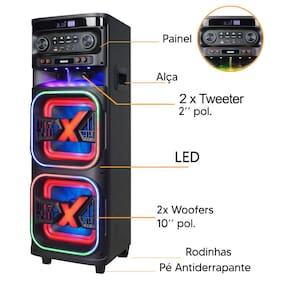 -Conectividades: USB / Cartão SD / Bluetooth / TWS / 2x P10