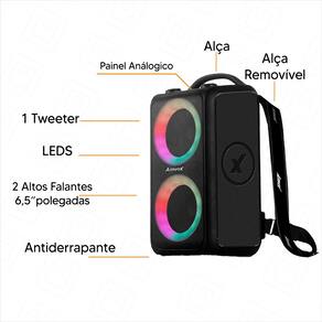Ela tem um design moderno e compacto, com display em LED, dois altos-falantes de 6,5’’ polegadas e um Tweeter 1’’ polegas com luzes LED dando um charme a mais.