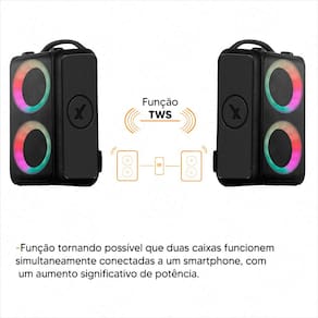 Tecnologia de conectividade como Bluetooth, Entrada auxiliar, 1x entrada P10 para ligar microfone ou instrumentos musicais, TWS conectando a duas Bagvox aumentando ainda mais sua potencia e a tornando sistema estéreo.