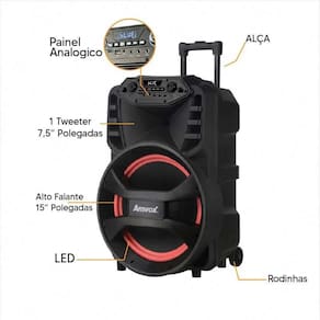 Características: :: Potência: 880W Rms :: Bluetooth :: Woofer de 15" :: Tweeter de 7,5" :: Entrada para 2 microfones e 1 instrumento :: Função Power X :: Função Prioridade microfone :: Entrada USB / TF Card :: Show de LED :: Bateria de até 4 horas :: Equalizador :: Função Passa e volta pasta