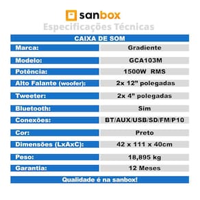 São 1500W RMS de pura potência. A Power Bass da Gradiente é equipada com dois Woofer de 12” polegadas e dois Tweeter de 4” polegadas. Essa caixa de som não possui bateria interna e funciona sendo alimentada por energia elétrica, sendo bivolt.