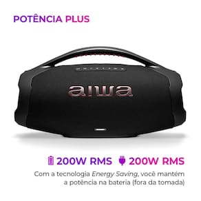 200W RMS DE POTÊNCIA: Sinta a experiência sonora impactante com os 200W RMS de potência da caixa portátil AIWA. Você será levado pela música com graves mais profundos e som potente. E, com a tecnologia Energy Saving, você mantém os 200W de potência até ouvindo música na bateria (fora da tomada).