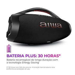 Reunir nossa família e amigos e desfrutar de uma boa música é um dos prazeres da vida, né? Curta um som potente e de alta definição com a Boombox Plus AIWA AWS-BBS-01-B! A caixa de som portátil foi projetada com sistema de som de 3 vias - 1 subwoofer, 2 midrange e 2 tweeters -, além de ter dois radiadores passivos laterais, 200W RMS de potência e o DNA japonês da marca AIWA. Com o certificado IP66, você e sua turma podem ouvir sua playlist favorita na beira da piscina ou na praia sem preocupação, já que a Boombox é resistente a jatos potentes de água e tem proteção total contra poeira. Incrível, né? Saiba mais sobre a AWS-BBS-01-B: