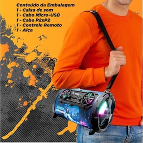 Potência real de 40W RMS Conexão Bluetooth 5.0 + EDR para maior alcance e estabilidade Entradas USB, MicroSD, AUX P2 e microfone com ajuste de volume Design portátil estilo canhão com alça de transporte Bateria recarregável de longa duração Voltagem Bivolt 110/220V