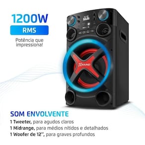 Sistema de som com 1200 W RMS de potência para uma experiência sonora incrível, com 3 vias composta por 1 Woofer 12 1 Midrange e 1 Tweeter.