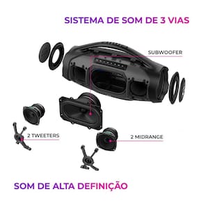 Curta um som potente e de alta definição com a Caixa de Som Aiwa Boombox, 200W RMS - AWS-BBS-01B! A caixa de som portátil foi projetada com sistema de som de 3 vias - 1 subwoofer, 2 midranges e 2 tweeters, além de ter dois radiadores passivos laterais, 200W RMS de potência. Com o certificado IP66, você e sua turma podem ouvir sua playlist favorita na beira da piscina ou na praia sem preocupação, já que a Boombox é resistente a jatos potentes de água e tem proteção total contra poeira.