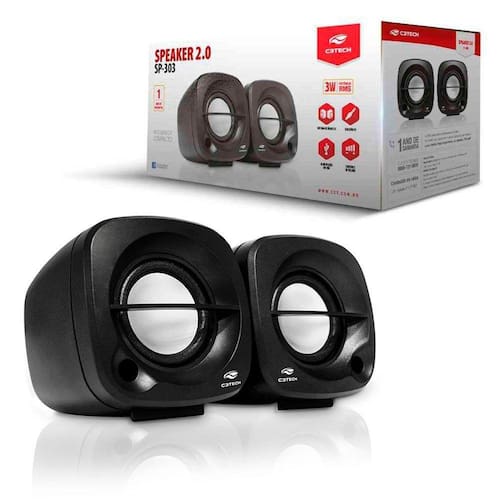 MARCA: C3TECHMODELO: SP-303BKA speaker SP-303 da C3Tech é perfeita para quem não abre mão de qualidade em suas musicas e procura por um produto com design moderno, leve e portátil. Com alimentação via porta USB e ideal para uso em computadores e notebooks. ESPECIFICAÇÕES: Desenvolvido para Notebook e Desktops; Mini Speaker; Sistema de Áudio 2.0; Blindagem eletromagnética; Ajuste de Volume no cabo; Conexão Áudio P2 3,5mm; Alimentação via USB; Voltagem: USB 5VDC 10%; Corrente: 100mA (Max); Dimensões: 78x78x75mm; Material: Plástico ABS; Peso: 220g; Cabo: 1,35m; Temperatura de trabalho: 0g ~ 45g; Umidade do ar: 45% ~ 90%; Frequência 20 Hz ~ 16 KHz; SNR:80db; Distorção: =0.5% 1W 1KHz; Impedância: 4O (Ohms); Potência: 3Watts; Certificações: CE, FCC.