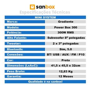 A Caixa De Som Mini System Bluetooth LED Gradiente Power Box 300 GMS 300 oferece uma experiência completa! Seja o DJ das suas festas e curta um som de extrema qualidade e potência com um ótimo custo benefício. A Power box 300 possuir um design elegante e um incrível show de leds, além de ser ter diversas funções para animar e divertir todos os momentos com amigos e familiares.