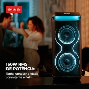 Elegância, tecnologia e sofisticação são palavras de ordem para a PartyBox AWS-PB-08. Com DNA AIWA, seus 160W RMS garantem a potência sonora para manter a animação lá em cima! São 2 woofers de 6,5’’, com graves mais profundos e poderosos, e 2 tweeters de 1,5’’, que trazem agudos claros e cristalinos. A PartyBox também vem com RGB Color Lights, para deixar a pista radiante! E a festa não vai parar tão cedo, pois a bateria pode durar até 8 horas ininterruptas. Saiba mais sobre a PartyBox AWS-PB-08 da AIWA:
