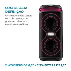 SOM DE ALTA DEFINIÇÃO: O sistema de duas vias ressoa a sincronia perfeita entre graves encorpados e agudos cristalinos. Resultado dos 2 woofers de 6,5’’, com graves mais profundos e poderosos, e dos 2 tweeters de 1,5’’, que trazem agudos claros e límpidos.