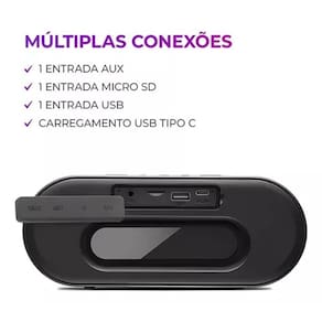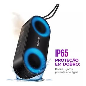 Especificação Cor: Preto Potência: 20W rms Proteção IP65 Frequência: 65Hz - 18KHz Potência da saída RMS: 2 x 10 W RMS Capacidade da bateria: 3.7v, 3000mAh Formato de músicas Suportados: MP3, WAV, WMA Resistente a Areia, Poeira e Água Bateria Recarregável lítio (15hr de duração) Entradas: Bluetooth 5.3 e P2 (3.5mm), USB, Tipo C Microfone Embutido 7 modos de luz Tempo de Bateria: Até 5 Horas e 30 minutos: volume 50% - luzes ligadas | Até 15 horas: Volume 50% - Luzes desligadas t\é 3 Horas volume 100% - luzes ligadas até 4 horas e 30 minutos – luzes desligadas Dimensões: 8 x 20 x 7 cm (AxLxC)