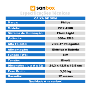 Totalmente versátil! Essa Caixa possui tecnologias como Função Philco connection (conectividade entre duas PCX4500) TWS que permite conectar duas caixas sem a necessidade de fios, com isso, você dobra a potência e criar uma imersão maior ao escutar suas músicas favoritas.