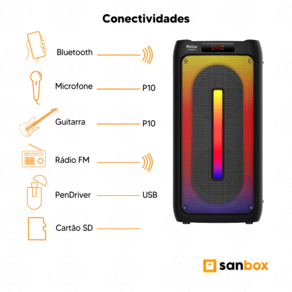 Essa caixa de som oferece algumas conexões e tecnologias como Bluetooth 5.3, rádio FM, mas você também pode reproduzir músicas por meio de entradas físicas, como pen drive (USB), cartão de memória ou até mesmo pela entrada auxiliar P2. Além disso, essa caixa de som também tem entrada P10 para a conexão de microfone e instrumentos musicais.