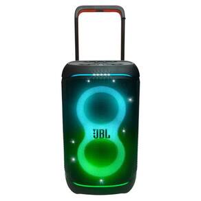 Pensada para a portabilidade e longas horas de festa, a caixa de som conta com uma bateria de ion de litio de 99,02 Wh, que proporciona uma autonomia de ate 15 horas de reproducao. O transporte e simplificado gracas a sua alca telescopica e rodas integradas. O show de luzes dinamico, que pulsa em sincronia com a musica, cria a atmosfera visual perfeita para a sua festa. E para que a diversao nao seja interrompida por imprevistos, o equipamento possui a certificacao IPX4, que garante resistencia a respingos de agua. Alem disso, a funcao de powerbank, disponivel atraves da porta USB-C, permite que voce carregue seus dispositivos, como celulares, diretamente na caixa de som.
