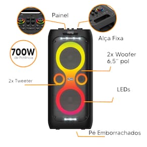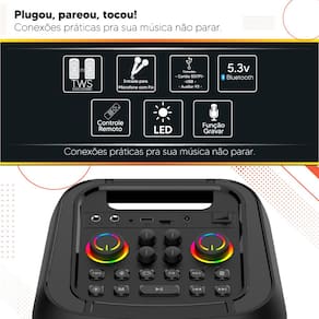Seu visual moderno com LEDs coloridos cria o clima ideal, enquanto o formato portátil garante praticidade para levar aonde quiser.