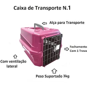 Especificações: - Produzida totalmente em plástico polipropileno com alta durabilidade - Fixação da tampa superior com a base por parafuso inox, sendo sua montagem muito fácil - Higiênica: pode ser lavada - Com ventilação lateral - Apto para viagens de avião - Peso suportado de até 3Kg - Cor: Rosa - Caixa de transporte tamanho N1