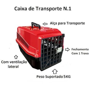 Especificações: - Produzida totalmente em plástico polipropileno com alta durabilidade - Fixação da tampa superior com a base por parafuso inox, sendo sua montagem muito fácil - Higiênica: pode ser lavada - Com ventilação lateral - Apto para viagens de avião - Peso suportado de até 5Kg - Cor: Vermelho - Caixa de transporte tamanho N1