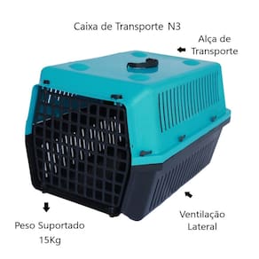 Especificações: - Marca: Alvorada - Produzida plástico resistente e atóxico - Higiênica: pode ser lavada - Com aberturas laterais permitindo maior circulação de ar - Apto para viagens de avião - Peso suportado de até 15Kg - Dispositivo para cadeado - Cor: Azul - Caixa de transporte tamanho N3