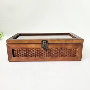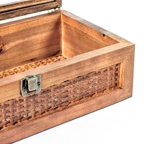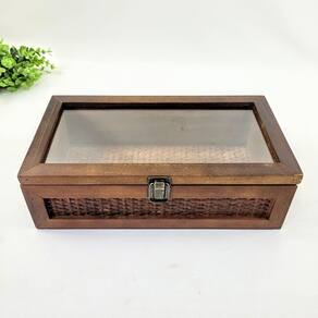 Habilmente combinando a solidez da madeira com a leveza e o toque artesanal do rattan, esta caixa apresenta uma tampa superior em vidro. Esse detalhe permite visualizar o conteúdo, ideal para expor itens de coleção, joias, relógios ou até mesmo pequenas lembranças. Com 9,5 cm de altura, 30 cm de largura e 16 cm de profundidade, ela tem o tamanho perfeito para ser disposta em mesas de centro, aparadores, estantes ou penteadeiras.
