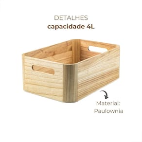 A Caixa Organizadora Modular Paulownia 4L Bambu Domu Keep Ou é fabricada em Paulownia, um material 100% renovável, e oferece praticidade e sofisticação para a organização da sua casa. Com alças que facilitam o transporte, essa caixa é perfeita para armazenar e proteger diversos objetos. Seu design modular permite que você crie diferentes composições, adaptando-se às suas necessidades. Com dimensões de 9cm de altura, 27cm de largura e 16.5cm de profundidade, a caixa possui uma capacidade de 4 litros.