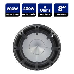 ESPECIFICAÇÕES TECNICAS DO SUBWOOFER HURRICANE CLASS 8": - Potencia maxima: 400 W - Potencia de entrada nominal RMS: 200 W - Resposta em frequencia: 356Hz ~ 1.2KHz - Sensibilidade: 87dB - Impedancia: 4 ohms - Cone: PP injetado - Borda: Borracha - Carcaça: Aço - Bobina: Aluminio 1" - Calota: PP