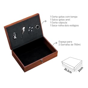- Design Elegante e Prático: O design interno da caixa foi meticulosamente planejado para comportar duas garrafas com segurança durante o transporte. Além disso, a disposição dos acessórios adiciona um toque de elegância à apresentação.