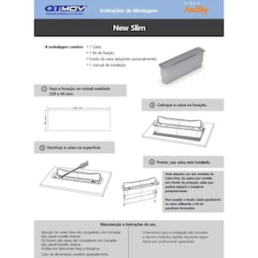 Caixa Embutir Para Mesa Móveis Com 03 Tomada 10A New Slim Preta New Slim - Linha Facility Modelo já acompanha 03 tomadas de 10A Caixa de tomadas para mesas de escritórios, mesas de estudas ou bancadas modernas. Organiza o espaço e evita acidentes.Melhor custo da categoria Facility que soluciona a conectividade em mobiliários.Fabricação: Termoplástico.Características do Produto:Baixo custo e fácil instalação.Passa cabos tipo rampa com abertura para passagem de cabos até 10 mm de diâmetro.Saída para os cabos em qualquer posição linear à caixa.Tampa com abertura mecânica manual . Capacidade: Para 3 tomadas tipo painel e 3 conectores Keystone. Modelo compatível com tomadas TIPO PAINEL das WEG ou Margirius. módulos dos modelos para alvenaria não funcionam na caixa . Dimensional externo: 242 x 53 x H=89 mm Gabarito de corte: 228 x 46 mm