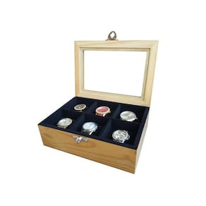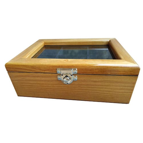 Prático e luxuoso, na linha madeira maciça encontrarmos um toque vintage, objeto decorativo onde são visíveis os veios naturais da madeira. Nossos estojos irão facilitar seu dia a dia com a organização e segurança que sua coleção precisa, além de proporcionar um ambiente mais sofisticado e elegante.Produzida com madeira natural de reflorestamento. Escolhida rigorosamente, totalmente tratada, tingida e envernizada externamente. Internamente, inclusive as divisórias são revestidas com nylon aveludado e as almofadas que acompanham o produto, normalmente são também em tecido aveludado. Na linha madeira maciça é possível observar os veios naturais da madeira. As dobradiças não são aparentes e possuem um limitador. A tampa possui visor com vidro transparente. Acompanha um fecho giratório de pressão em metal, ideal para colocar cadeado. Seus relógios sempre bem protegidos e acomodados confortavelmente, com toda segurança e facilidade no manuseio. Características das caixas para relógio: - Produto fabricado em madeira maciça de qualidade; - Padrão Cerejeira; - Não empena; - Revestimento interno aveludado, inclusive as divisórias; - Fecho giratório de pressão em metal suporta cadeado ; - Tampa de vidro 2 mm; - Acompanha almofadas para todos os casulos - Medidas aproximadas dos casulos larg x comp x alt : 7,5 x 7,5 x 7,0 cm. Relógios não acompanham o estojo Imagens meramente ilustrativas