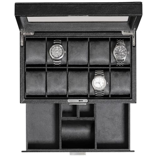 10 COMPARTIMENTOS DE RELÓGIO GRANDES E GAVETA DE VALET Cada almofada mantém um relógio pequeno ou grande perfeitamente no lugar, até um ao lado do outro. Há muito espaço entre a tampa e as almofadas para acomodar relógios de todos os tamanhos. Uma gaveta deslizante pode conter relógios e pulseiras adicionais ou oferece espaço extra para guardar suas abotoaduras, anéis, prendedores de gravata, óculos de sol, canetas, dinheiro, cartões ou suas ferramentas de relógio. QUALIDADE INCOMPARÁVEL E DESIGN SOFISTICADO Nossa caixa possui um design único e moderno que é a combinação perfeita de classe e funcionalidade. Cada caixa usa uma moldura de madeira envolta em couro PU de alta qualidade. O interior é revestido com um elegante tecido de micro camurça cinza. PRESENTE PERFEITO Seja um presente de Natal, presente de aniversário para seu marido, presente de aniversário para seu filho, presente de Dia dos Pais para o pai ou mesmo dia das mães, você certamente encantará até o destinatário mais difícil de agradar. Nosso design unissex é perfeito para qualquer colecionador de relógios em sua vida Ou dê a si mesmo Seus relógios merecem Marca: Não Informado