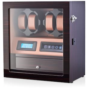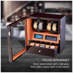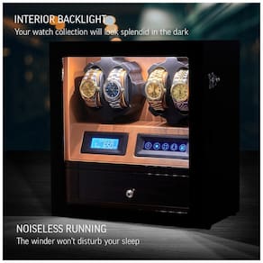 COMPATIBILIDADE UNIVERSAL 2 rotores programados individualmente e 15 programas de corda disponíveis oferecem compatibilidade para todos os modelos de relógio. Você pode definir o número de Turns Per Day de 650 a 1950 TPD. LUZ INTERIOR O movimentador do relógio possui luzes LED integradas. Os relógios ficam especialmente bonitos no escuro. OPÇÃO MOTOR STOP Ao abrir a porta, os rotores são desligados automaticamente. Isso permite que você evite a quebra do mecanismo de corda ao consertar o relógio. O relógio de pulso pode ser instalado ou removido apenas quando os rotores estão parados. TODA A SUA COLEÇÃO DENTRO 4 slots para enrolador de relógios e 5 compartimentos de zenamento de relógios proporcionam máxima usabilidade em um tamanho compacto. O DOOR LOCK permite impedir o acesso indesejado Marca: Não Informado
