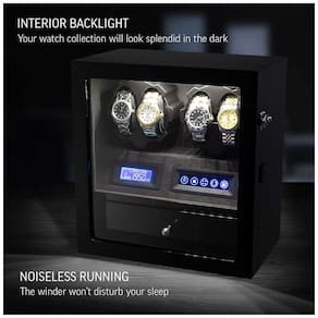 COMPATIBILIDADE UNIVERSAL 2 rotores programados individualmente e 15 programas de corda disponíveis oferecem compatibilidade para todos os modelos de relógio. Você pode definir o número de Turns Per Day de 650 a 1950 TPD. LUZ INTERIOR O movimentador do relógio possui luzes LED integradas. Os relógios ficam especialmente bonitos no escuro. OPÇÃO MOTOR STOP Ao abrir a porta, os rotores são desligados automaticamente. Isso permite que você evite a quebra do mecanismo de corda ao consertar o relógio. O relógio de pulso pode ser instalado ou removido apenas quando os rotores estão parados. TODA A SUA COLEÇÃO DENTRO 4 slots para enrolador de relógios e 5 compartimentos de zenamento de relógios proporcionam máxima usabilidade em um tamanho compacto. O DOOR LOCK permite impedir o acesso indesejado Marca: Não Informado