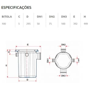 Características: - Bitola: 100 - Código: 27801005 - Matéria-prima - Corpo: PVC e Tampa: ABS; - Cor - Corpo: Cinza e Tampa: Preta; - Diâmetros - 2 entradas de 75mm e 1 entrada de 50mm; - 1 saída de 100mm (Juntas de dupla atuação); - Temperatura máxima - 45°C; - Dimensões - 558mm x 300mm; - Capacidade - 19 litros de gordura (superior ao exigido pelanorma NBR 8160), atendendo a uma pia de cozinha residencial; - Pode ser utilizada em regiões com lençol freático elevado; - Contém cesta de limpeza com alça para auxiliar na retiradados resíduos sólidos (gordura); - Cesto de Limpeza pode ser adquirido separadamente; - Normas de Referência - NBR 8160.