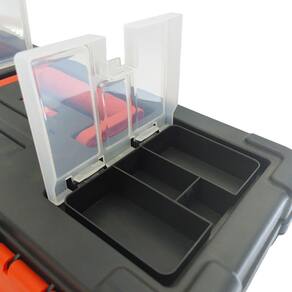 A caixa possui compartimento interno e uma bandeja removível, permitindo que as ferramentas fiquem organizadas e fáceis de localizar, também dois compartimentos externos na tampa superior para itens menores, como parafusos, pregos e porcas. Isso ajuda a manter tudo organizado e fácil de encontrar.
