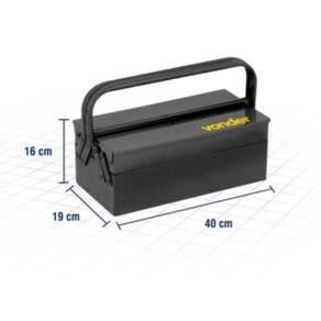 Conteúdo da Embalagem: 1 Caixa metálica para ferramentas Indicada para acondicionamento de ferramentas e afins Produzida em estrutura em chapa de aço 1010/1020 e pintura a pó. Possui 3 gavetas, uma fixa e duas articuladas, alça reforçada e porta cadeado. Comprimento da caixa para ferramentas: 40 cm Largura da caixa para ferramentas: 19 cm Altura da caixa para ferramentas: 16 cm Material da caixa para ferramentas: Chapa de aço Cor da caixa para ferramentas: Preta Capacidade de carga kgf : 20 kgf Garantia - E CDC : Garantia legal: 90 dias