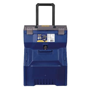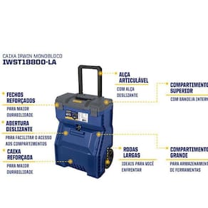 Caixa monobloco com reforçada proporcionando durabilidade, com compartimento grande para armazenagem de ferramentas elétricas, alça articulável com trava deslizante para melhor transporte e fechos reforçados. Possui compartimento superior com bandeja interna, abertura deslizante para facilitar o acesso aos compartimentos e rodas largas ideais para enfrentar diferentes terrenos.