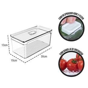 - Ideal para armazenar os alimentos, para conservar frutas, legumes e verduras. - Deixe a sua geladeira mais organizada e prática. - Otimiza espaço. - Com transparência para visualizar melhor os alimentos. - Livre de Bpa - Frescor prolongado para uma rotina sem desperdícios. - Com respiradouro, para fechar quando for guardar alimentos cortados ou para que as folhas não murche. E deixar aberto quando for guardar frutas com cascas. - Sistema de drenagem, através da bandeja interna que permite o fluxo de ar por todos os cantos, ajudando a prevenir a deterioração precoce.