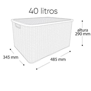 Por uma das grandes empresas no cenário nacional do segmento de utilidades domesticas a Paramount Plásticos. Busca como sua missão, oferecer produtos que tragam praticidade para o dia a dia das pessoas. Dimensões da Caixa Organizadora Rattan Grande com Tampa 40 Litros Caixa rattan grande : Altura 29 cm x Largura 34,5 cm x Comprimento 48,5 cm Embalagem: Altura 32 cm x Largura 36 cm x Comprimento 50 cm