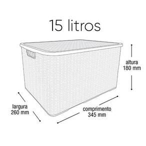 - A caixa possui capacidade de 15 litros, sendo ideal para armazenar roupas, sapatos, acessórios e outros itens de forma organizada.