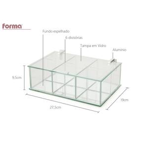 Caixa com tampa de vidro e alumínio com fundo espelhado e 6 divisórias